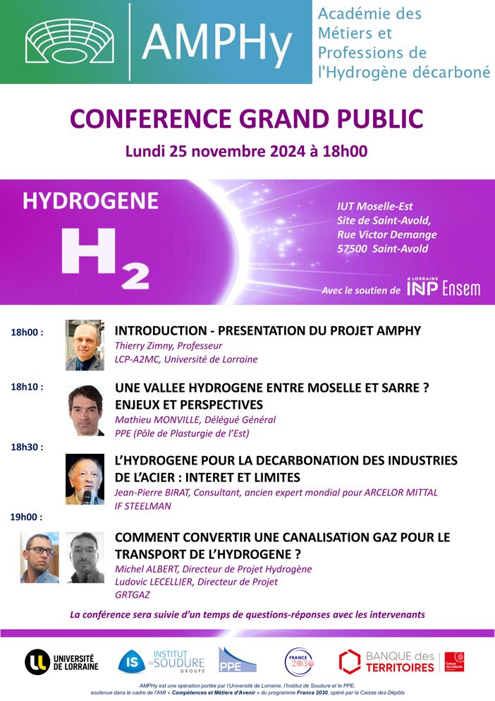 Le projet AMPHy – Académie des Métiers de l’Hydrogène décarboné (AMI-CMA, France 2030) a l’immense plaisir de vous convier à la deuxième conférence grand public sur l’hydrogène. La conférence se déroulera le 25 novembre 2024 à 18h00, à l’IUT Moselle-Est, site de Saint-Avold, Rue Victor Demange, 57500 Saint-Avold.